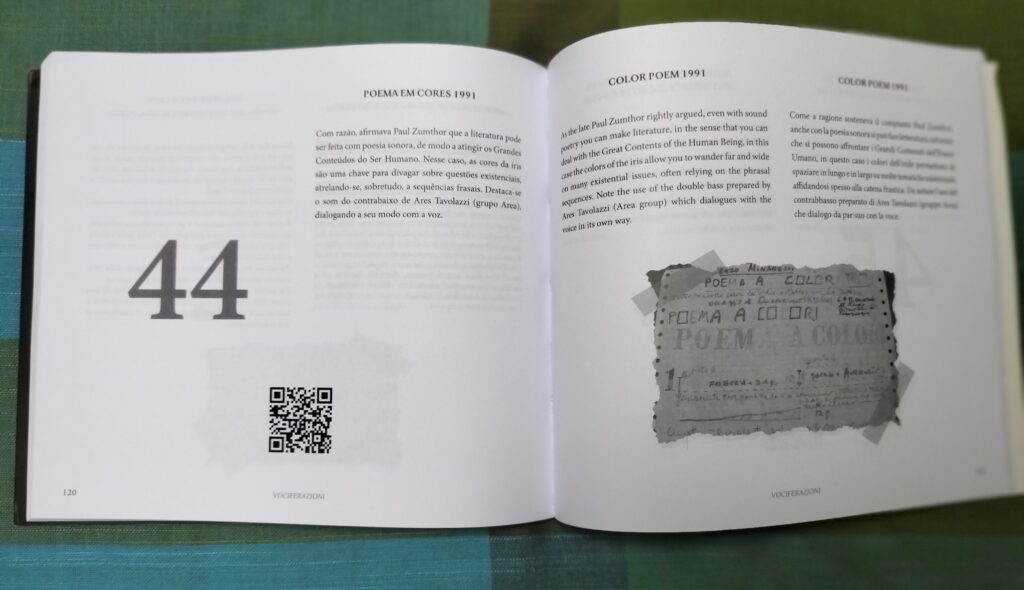 Vociferazioni is a trilingual work (Brazilian-English-Italian) that gathers together the performance patterns of the sound poems produced by Enzo Minarelli from 1978 to 2019. Through 69 QR Codes it is possible to see and listen to extracts of the same polypoems. It is published by EDUEL, a Brasilian university press.